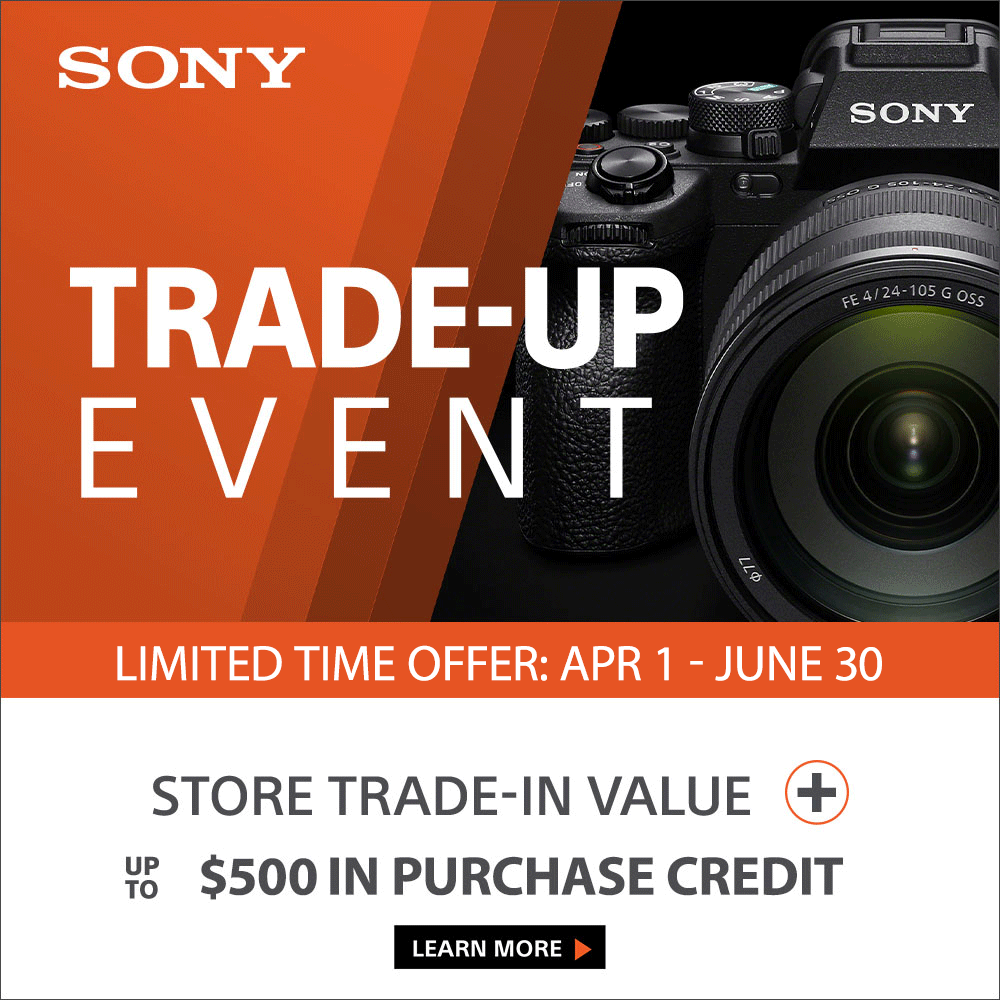 Trade-in one working digital interchangeable lens camera or lens and receive up to $500 trade-in bonus towards the purchase of select Sony Full-Frame mirrorless cameras and lenses.